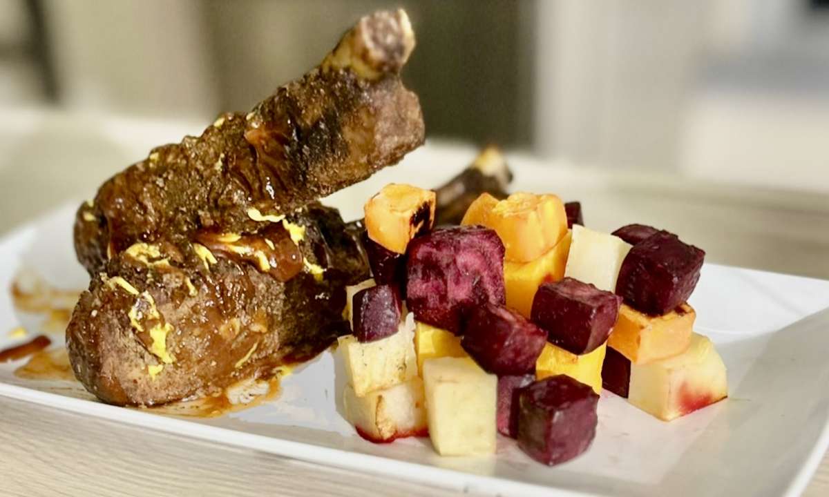 Herb-mustard crusted, with roasted sweet potatoes and grilled zucchini & yellow squash ribbons.
