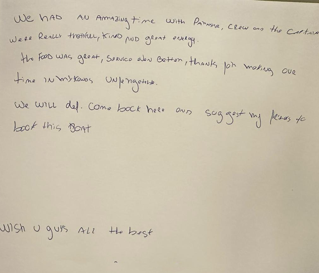 We had an amazing time with PARADISE. The crew and the Captain were really thoughtful, kind, and had great energy.