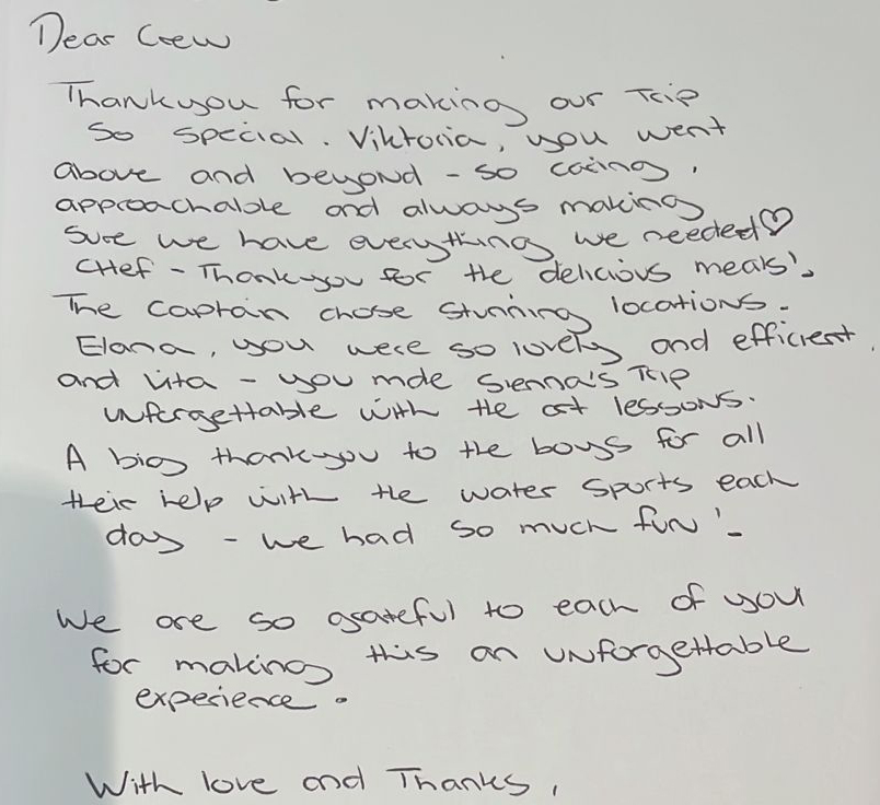 Tatiana, Val, Maria, Captain Aris, Nicolas, Chef Antonis, Vassilis, George and Bakir we love you!!! You made trip so wonderful.