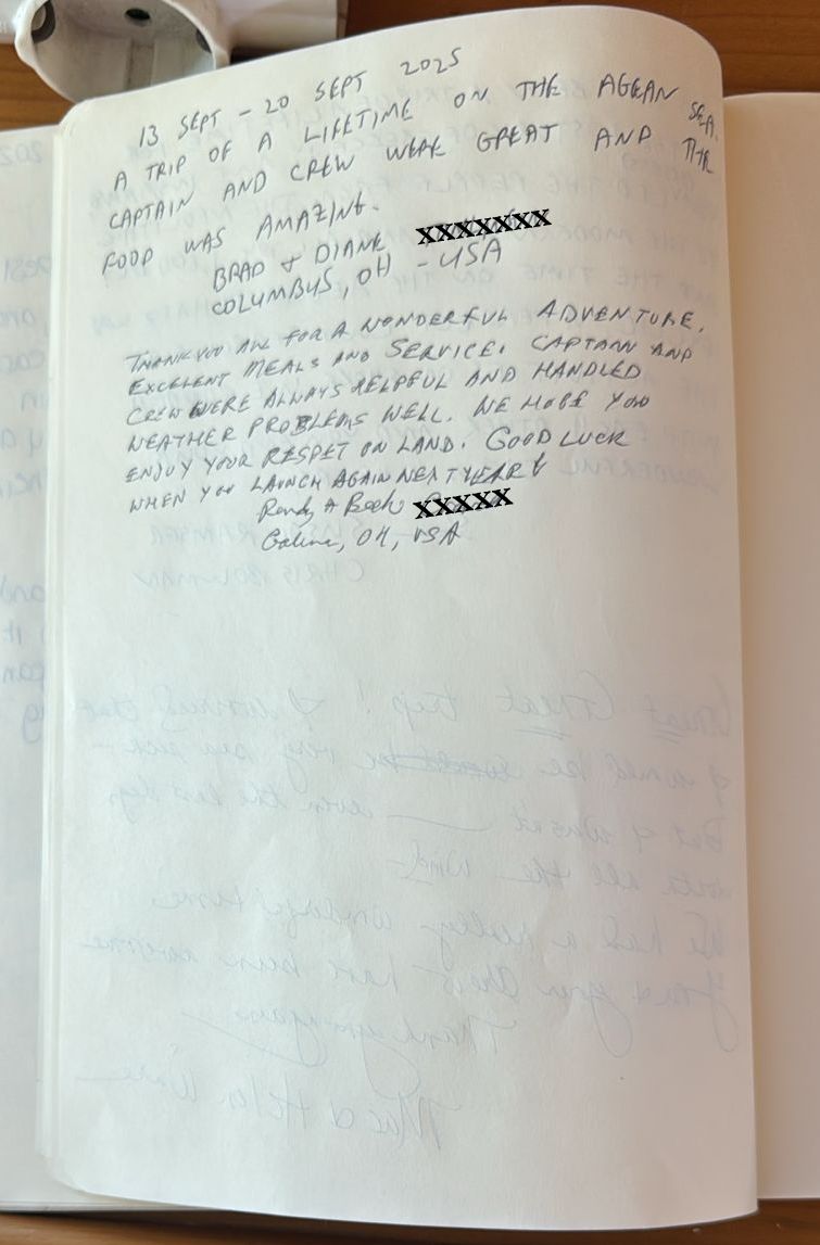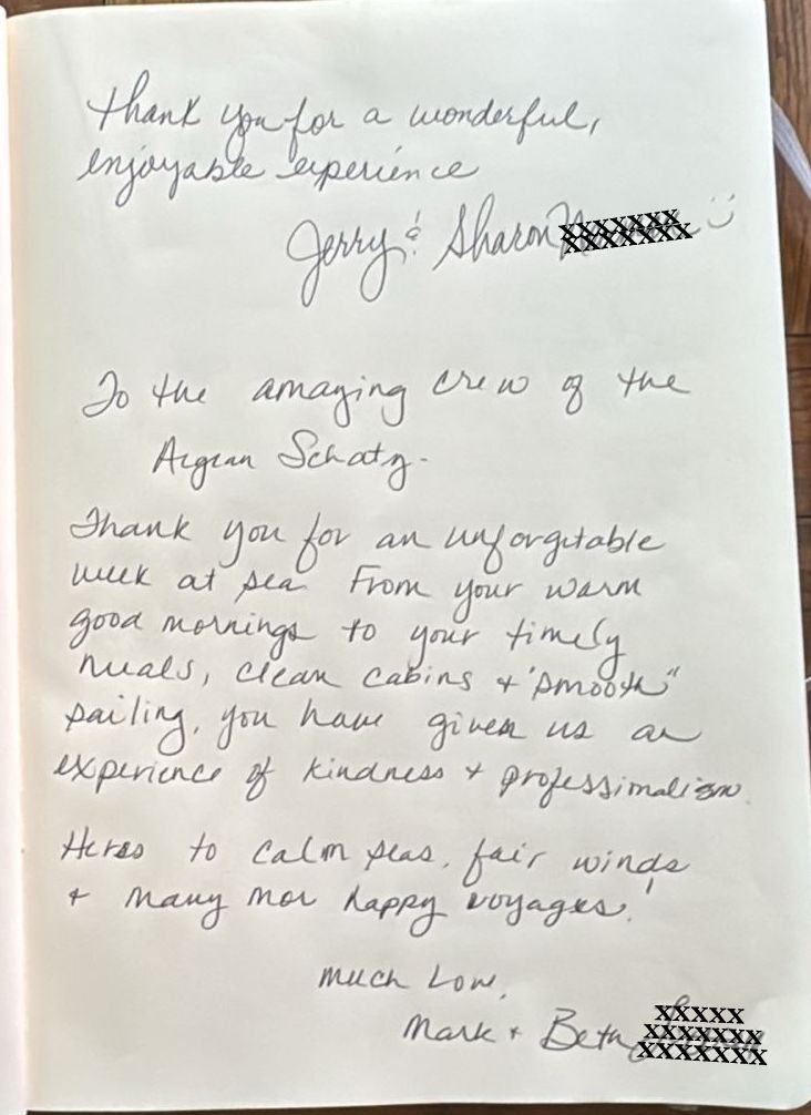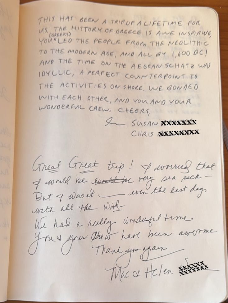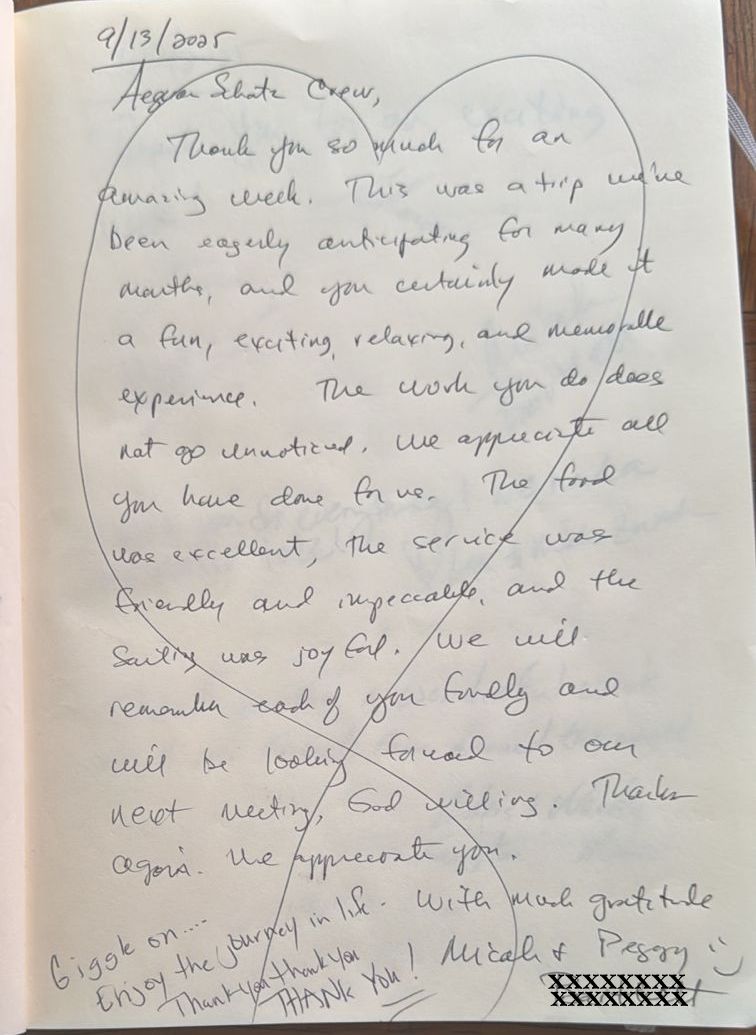 For Aegean Schatz crew: Thanks you so much for your excellent service on board. You made the trip memorable and fun. Great food also!