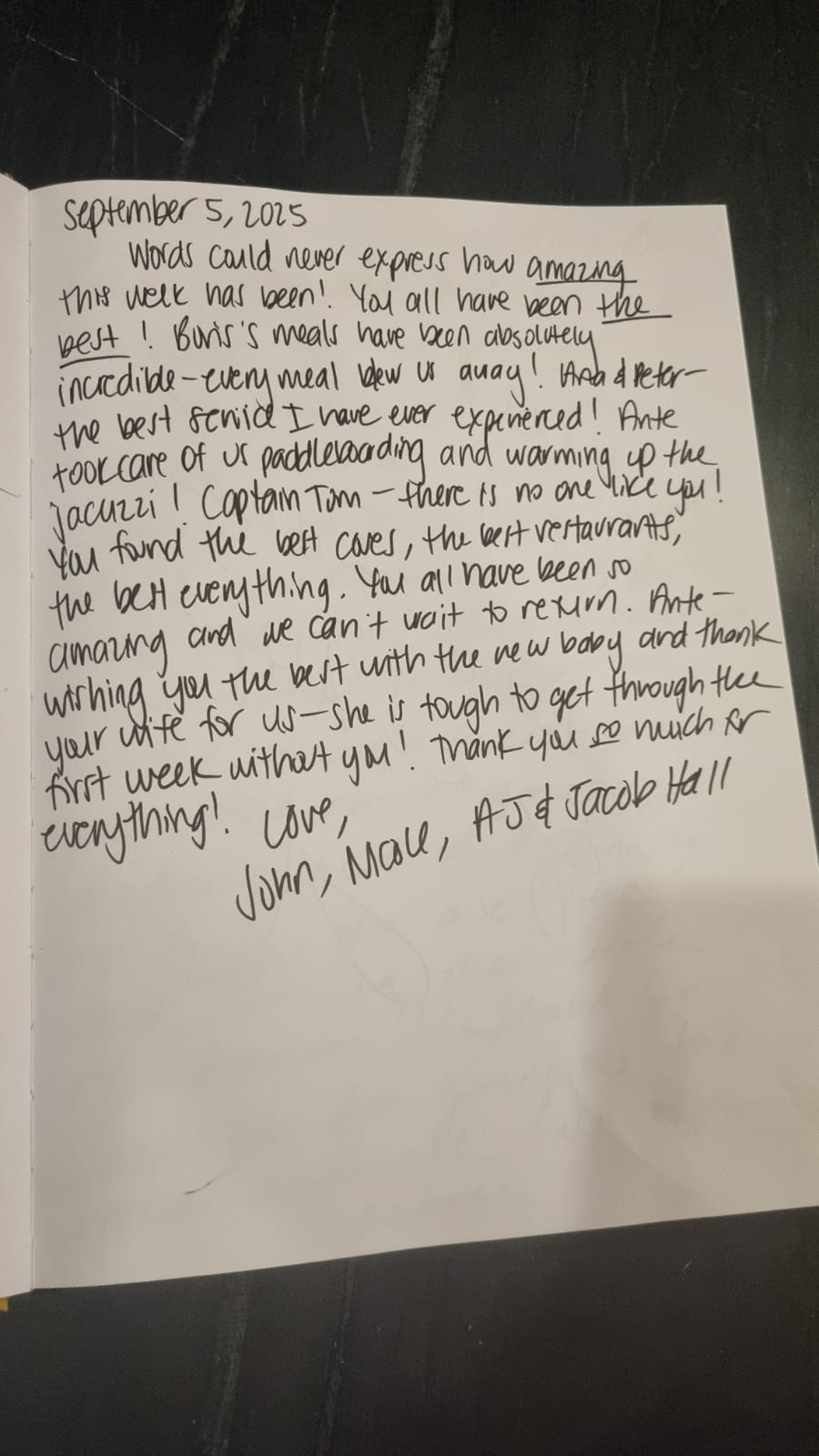 experienced! Ante took care of us paddle boarding and warming up the jacuzzi! Captain Tom - there is no one like you! You found the best coves, the best restaurants, the best everything. You all have been so amazing and we can’t wait to return. Ante - wishing you the best with you new baby and thank your wife for us - she is tough to get through the first week without you! Thank you SO much for everything!”
